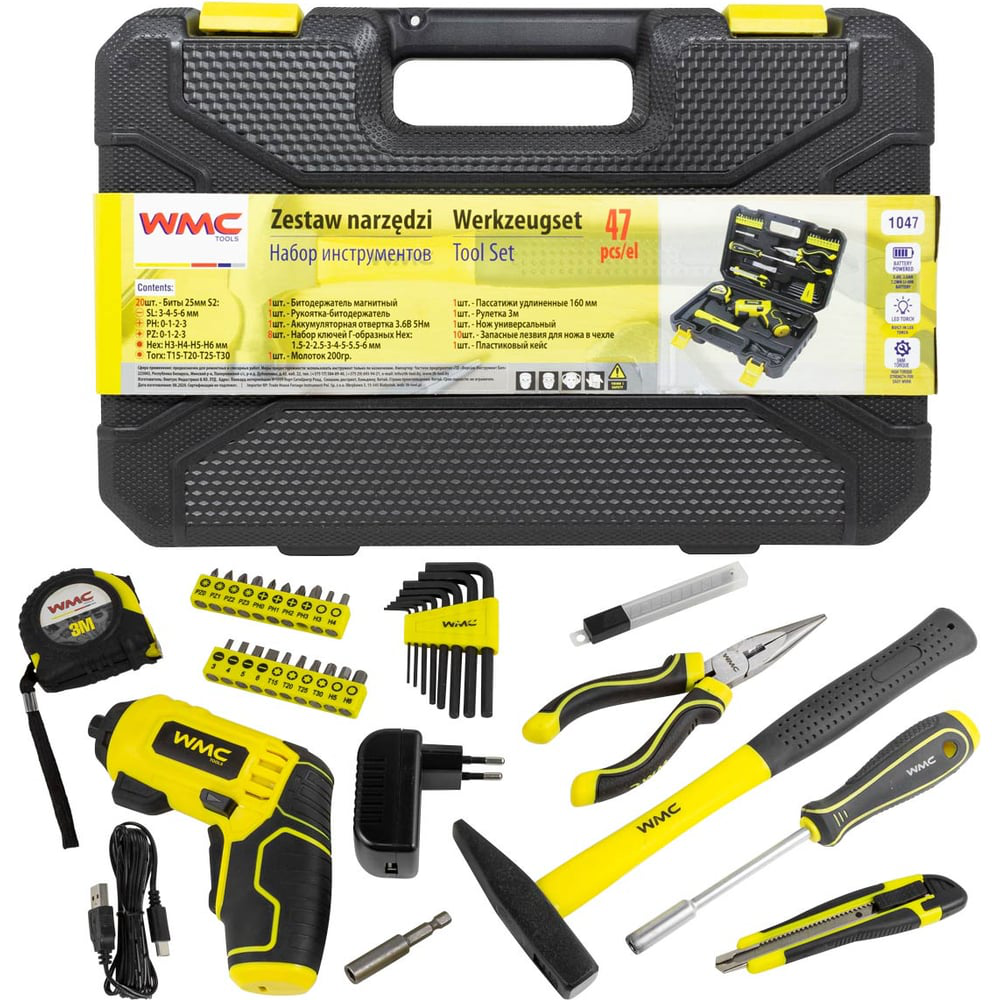 Набор инструментов WMC Tools с аккумуляторной отверткой в пластиковом кейсе — ваш надежный помощник в быту, дома, на даче или в гараже.Состав набораАккумуляторная отверткаБиты: Разнообразные размеры для выполнения различных задач.Магнитный битодержательРукоятка-битодержательКлючи Г-образной формыДругие мелкие предметыКомпактность: Удобен в использовании и легко хранится в ящике для инструментов.Качество материалов: Высокопрочный сплав металла обеспечивает устойчивость к коррозии и износу, что гарантирует долгий срок службы инструментов.ПрименениеМногофункциональный набор инструментов WMC-1047 можно использовать как дома, так и на работе. Он станет отличным подарком для любителей слесарных и ремонтных работ, позволяя быстро решать различные задачи, связанные с ремонтом и строительством.Набор WMC Tools — это идеальный выбор для тех, кто ценит качество, удобство и многофункциональность в своем инструменте!