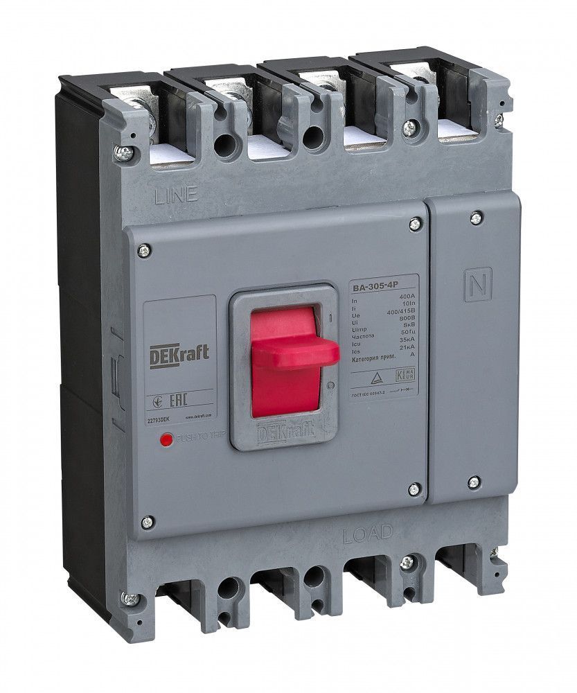 Продукт '22791DEK Силовой автоматический выключатель 4P 315А 35кА ВА-305 (литерный корпус ВА-300)' представляет собой высококачественное электрическое устройство, предназначенное для защиты электрических сетей и оборудования от перегрузок и коротких замыканий.Данный силовой автоматический выключатель имеет четыре полюса (4P) и номинальный ток 315А, что позволяет использовать его в различных мощных электрических системах. Он способен выдерживать ток короткого замыкания до 35кА, обеспечивая надежную защиту от возможных аварийных ситуаций.