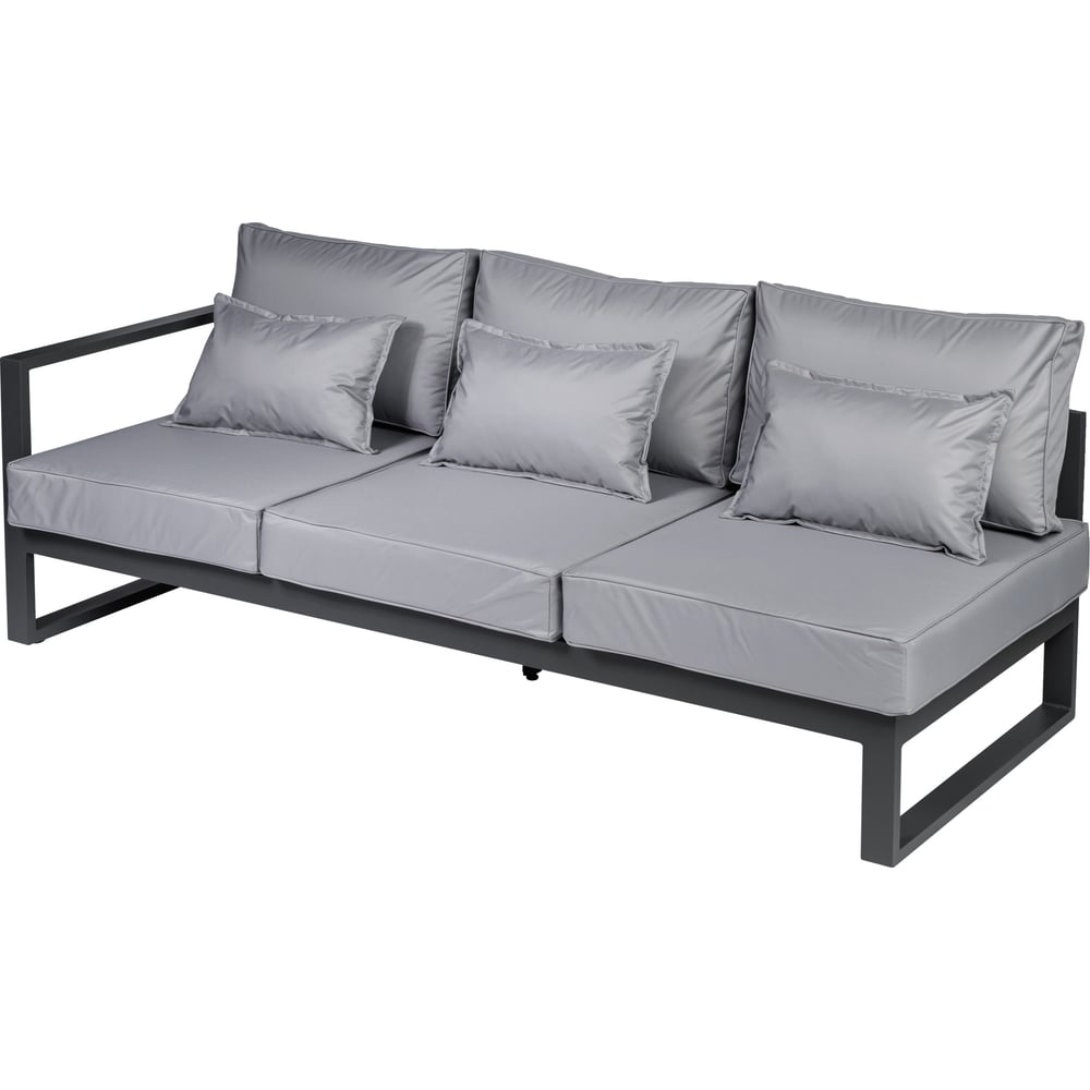 Диван «Лагуна» 3-х местный левый (с правым подлокотником). Каркас: алюминий, окрашенный в цвет антрацит. Размеры дивана ШхВхГ 2040х600х800 мм. Размеры подушек: для сиденья ШхВхГ 660х120х800 мм; Вес 3 кг. Подушка под спину 660х390 мм. Вес 1,8 кг. Чехлы на подушки съемные, сшиты из ткани оксфорд. Ткань оксфорд, обладает водоотталкивающими свойствами, высокой прочностью, эластичностью, устойчивостью к истиранию, многократному сгибу и действию химических реагентов. Наполнитель: многослойный формованный ППУ различной плотности, синтепон и спанбонд. Чехлы подушек на молнии. Вес каркас: 16 кг. Продукция поставляется в собранном виде (кресло + 9 подушек). Лагуна — роскошная серия с бесконечными возможностями комбинаций. В нем есть все, что вам нужно, чтобы построить красивую, удобную гостиную зону в вашем собственном стиле. Товары из коллекции «Лагуна» сочетают в себе лаконичный дизайн, чистоту форм и линий, иллюстрируют тренд на экологичность, подчеркивают безупречный вкус и статус владельца. Эта садовая мебель поставляется в сборе, вам не потребуются никакие инструменты или услуги специалиста по монтажу – достаточно вскрыть упаковку, установить каркас дивана или кресла, разместить на нем удобные подушки и наслаждаться отдыхом на природе! Кроме того, каркас диванчика без подушек достаточно легкий, поэтому его с легкостью можно перемещать и обустраивать новые лаундж-зоны или менять мебельную композицию по настроению и случаю.