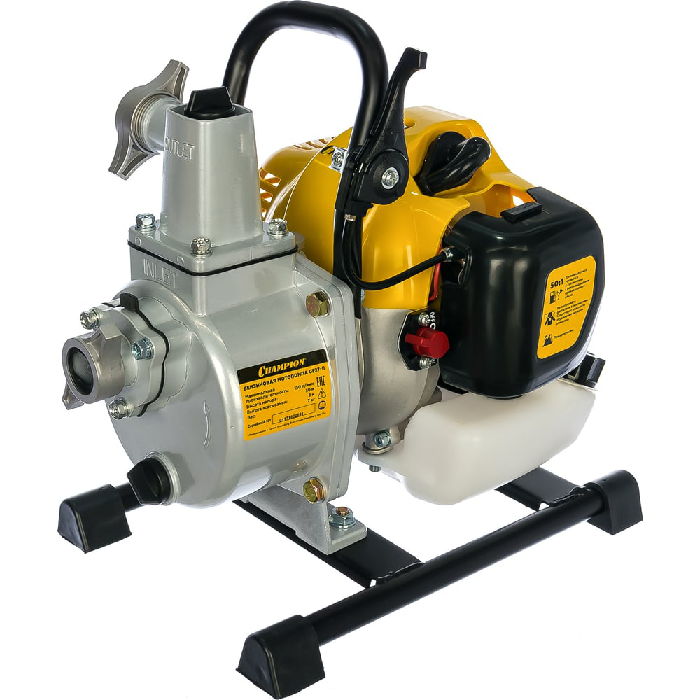 Мотопомпа Champion GP27-II предназначена для перекачки чистых жидкостей. Оснащена патрубками диаметром 25 мм. Отличается пропускной способностью 130 л/мин. Двигатель работает на топливной смеси: бензин АИ-92 + моторное масло (50:1). Праймер обеспечивает легкий и быстрый запуск двигателя. В конструкции имеется рама с ножками для устойчивости мотопомпы на любой поверхности.
